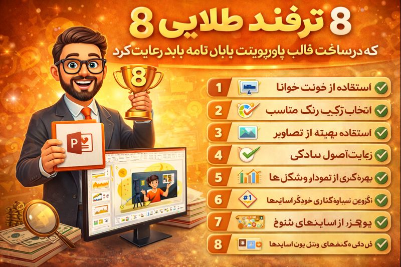 طراحی یک قالب پاورپوینت برای پایاننامه نیاز به توجه به جزئیات و رعایت اصول طراحی دارد. با استفاده از این ۸ ترفند طلایی، میتوانید قالبی جذاب، ساده و حرفهای بسازید که به شما کمک کند تا بهترین ارائه ممکن را داشته باشید. رعایت این نکات نه تنها جذابیت بصری ارائه شما را افزایش میدهد بلکه به مخاطب نیز کمک میکند تا مطالب شما را به راحتی درک کند.